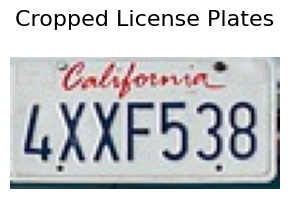 display_images(cropped_license_plates, title="Cropped License Plates", figsize=(3, 2))