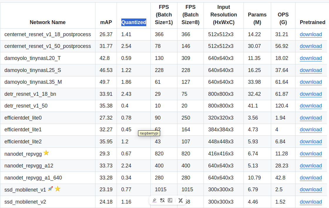 In this context, the “Quantized” number represents the degradation in model performance (often measured in terms of accuracy or mAP) due to quantization. Quantization is a technique where model parameters are reduced in precision (e.g., from 32-bit floating-point to 8-bit integers), typically to make the model run faster and use less memory. However, this process can cause a slight reduction in accuracy.