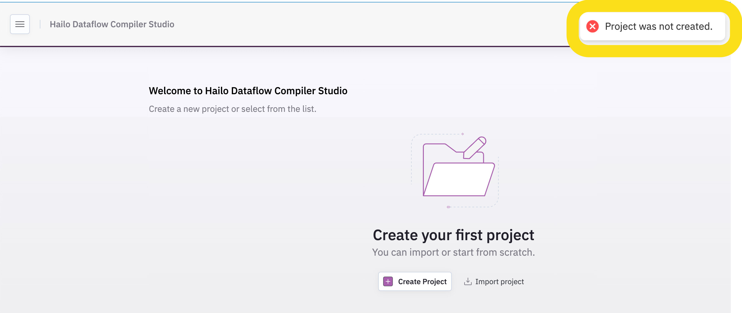 Then I get the screen “Create your first project”, enter my project name, and click “Create Project”. No project is created, and I get an indicator in the upper right “Project was not created”. No other error messages show in terminal were I ran Studio.