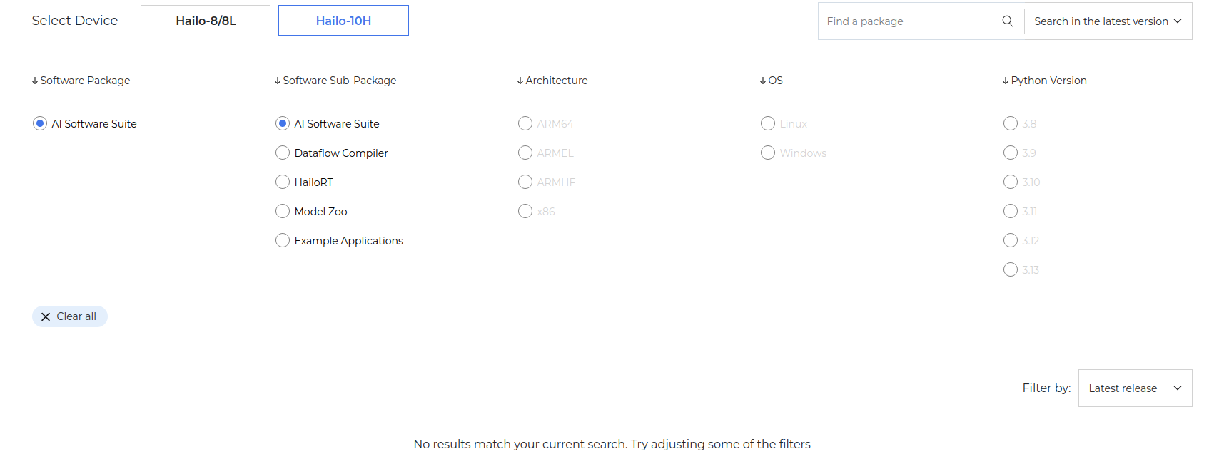 When I go to https://hailo.ai/developer-zone/software-downloads/ and select device: Hailo-10H there is nothing to download (picture related). The same thing happens when I go to Documentation