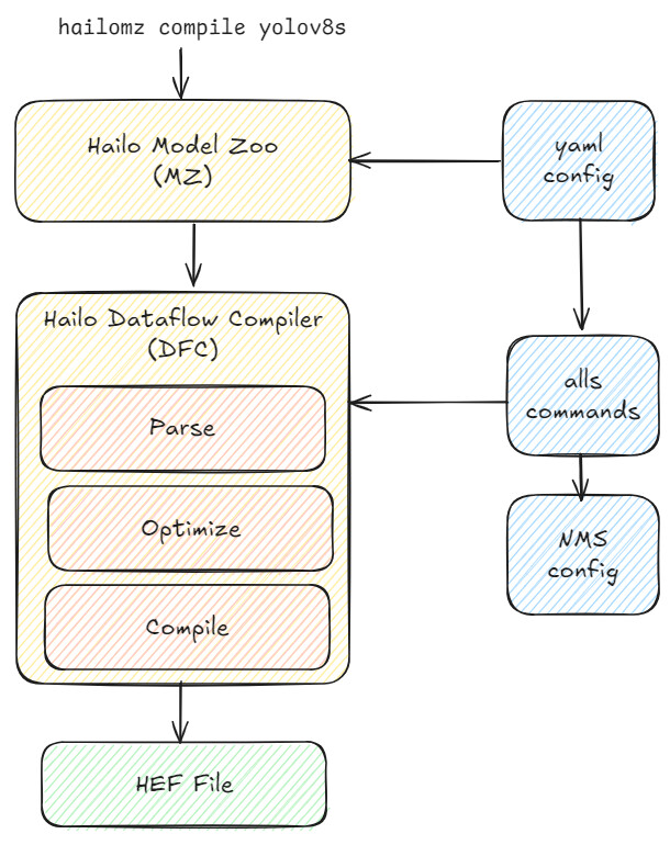 The Model-Zoo further uses the Dataflow Compiler (DFC), the compile reads in an alls file as input commands, since NMS addition has many commands it was externalize into a seperate file.