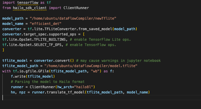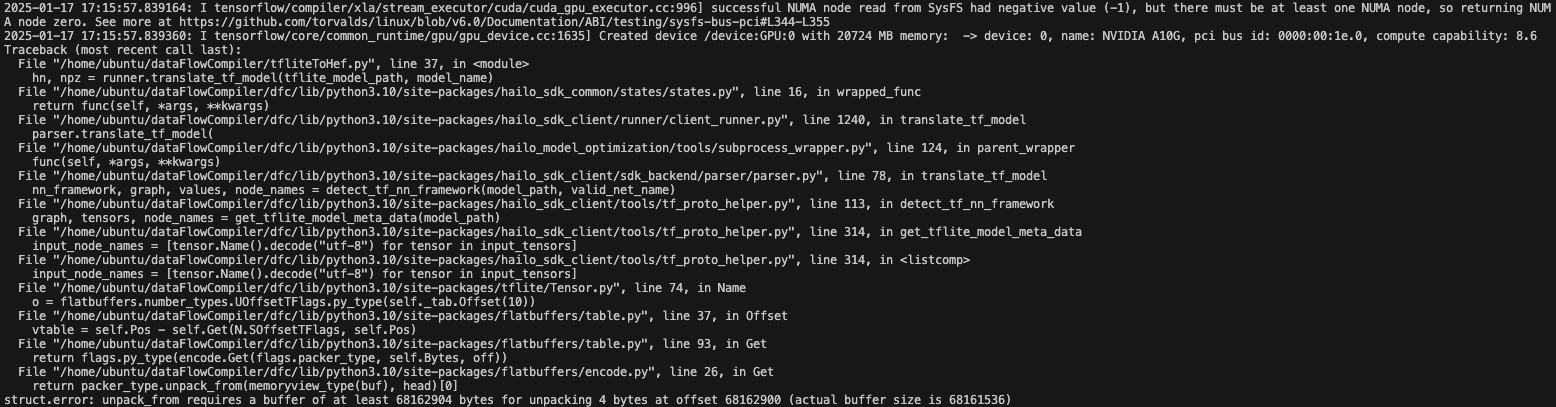 I am currently attempting to parse an Efficient-det model that is uses the tflite framework, but saved in a directory containing a checkpoint file and a variable folder. I used the example code from the Data Flow Compiler documentation to convert the saved model to tflite, then parse. What can be the meaning of this error?