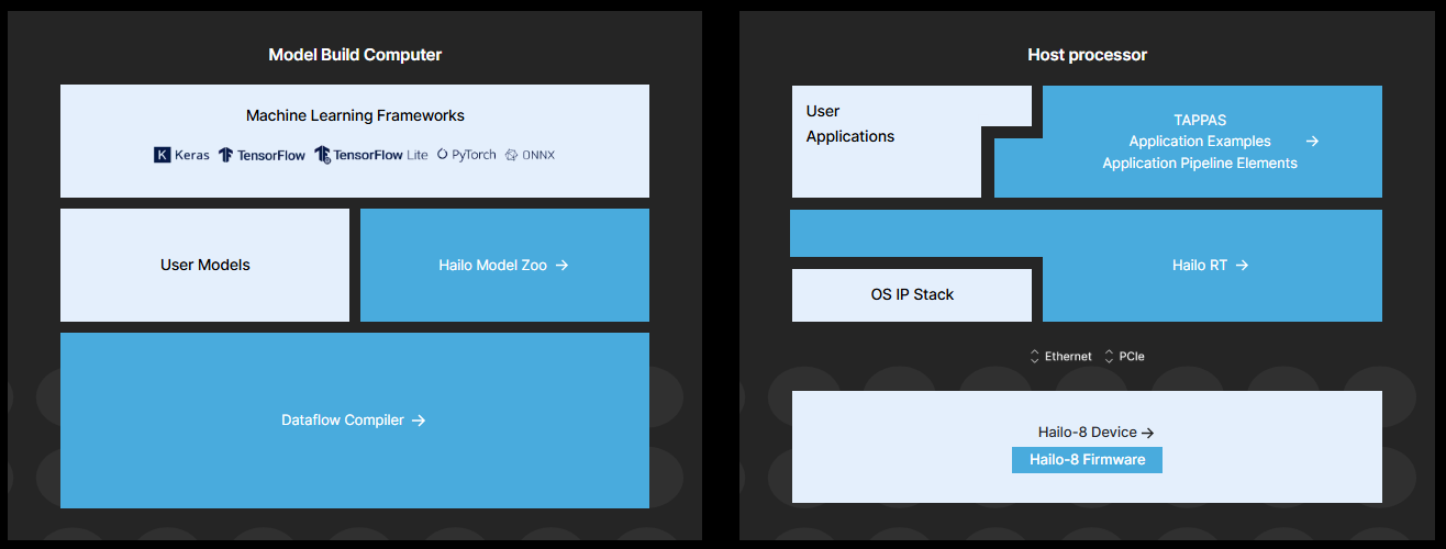 The Hailo AI Software Suite contains the software to convert a model from ONNX/TFLite into the Hailo Executable Format (HEF). We call this the model build environment (left side of the image below). This runs on a x86 machine only under Ubuntu 22.04 or 24.04. The AI Software Suite can be downloaded from the Developer Zone.