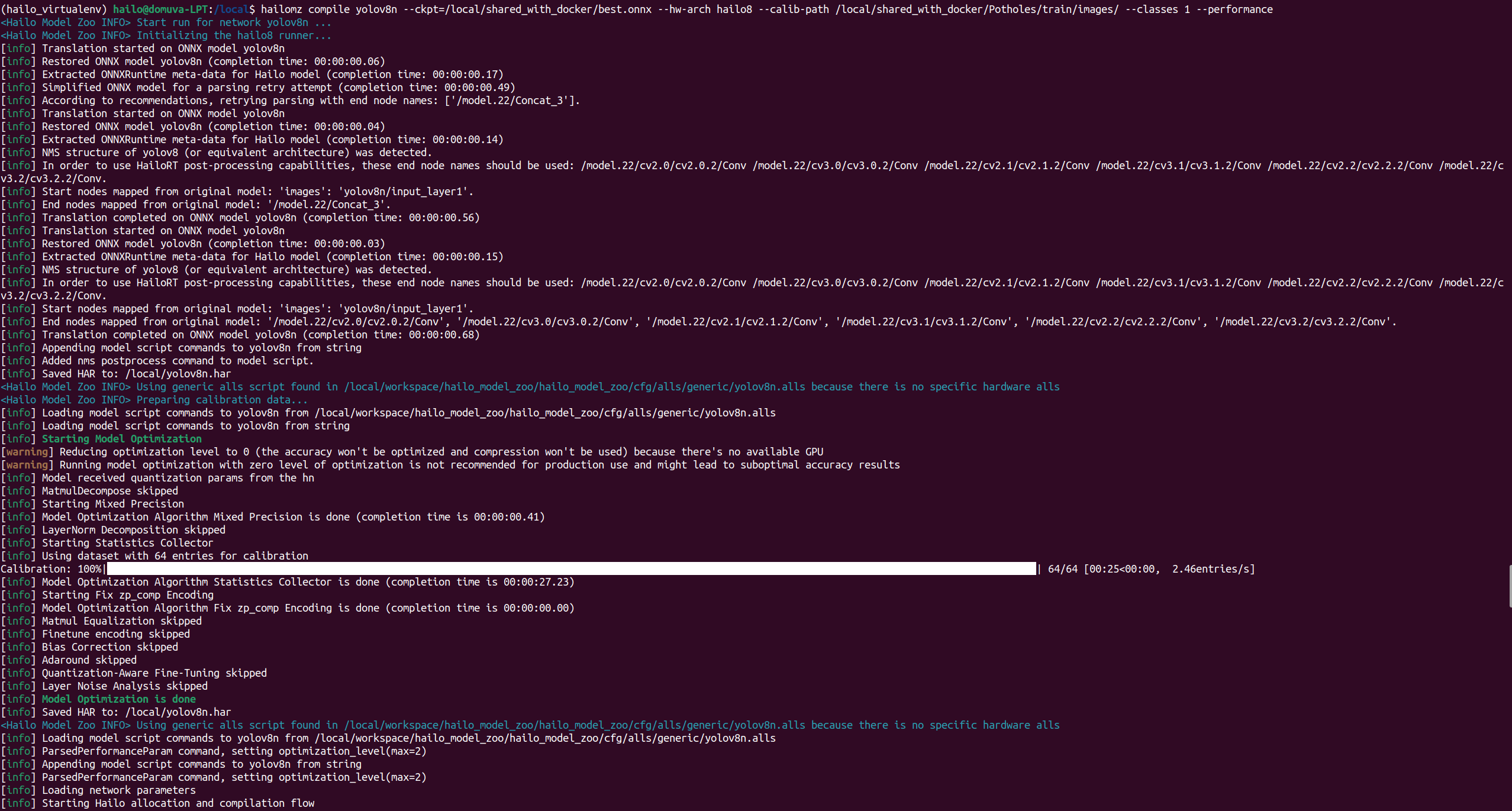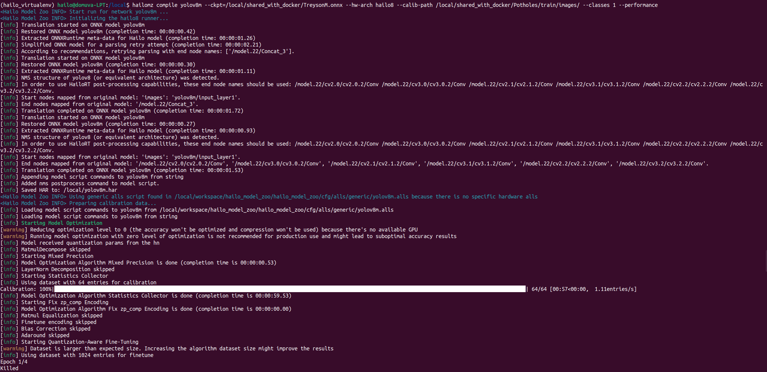I am trying to convert a YOLOv8m model to HEF and I am running into an issue on the Quantization-Aware Fine-Tuning step. It will run for a minute or two and then gets killed: