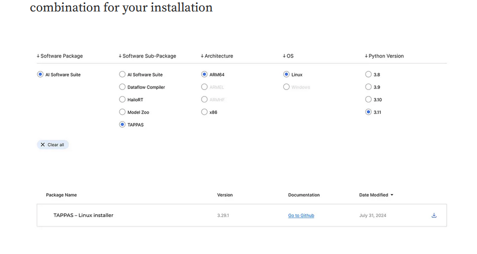 $ pip3 install hailort-4.18.0-cp311-cp311-linux_aarch64.whlrequired activating the venv first, otherwise it refused.- downloading TAPPAS is currently available for x86 only, I assume it changed since you took the screenshot, which shows the option for arm64 as well. That is the current state: