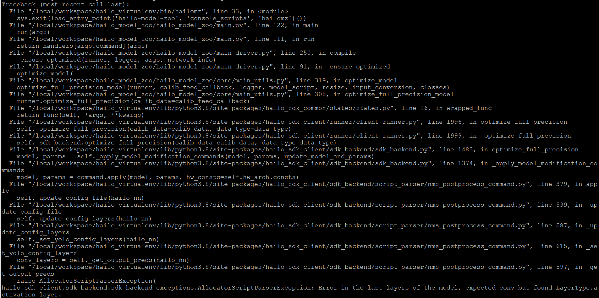Command I tried to execute : hailomz compile --ckpt /local/workspace/chip_v2.onnx --calib-path /local/workspace/images/ --yaml /local/workspace/hailo_model_zoo/hailo_model_zoo/cfg/networks/yolov8n.yaml --start-node-names images --end-node-names /model.22/Sigmoid /model.22/dfl/Reshape_1 --classes 80