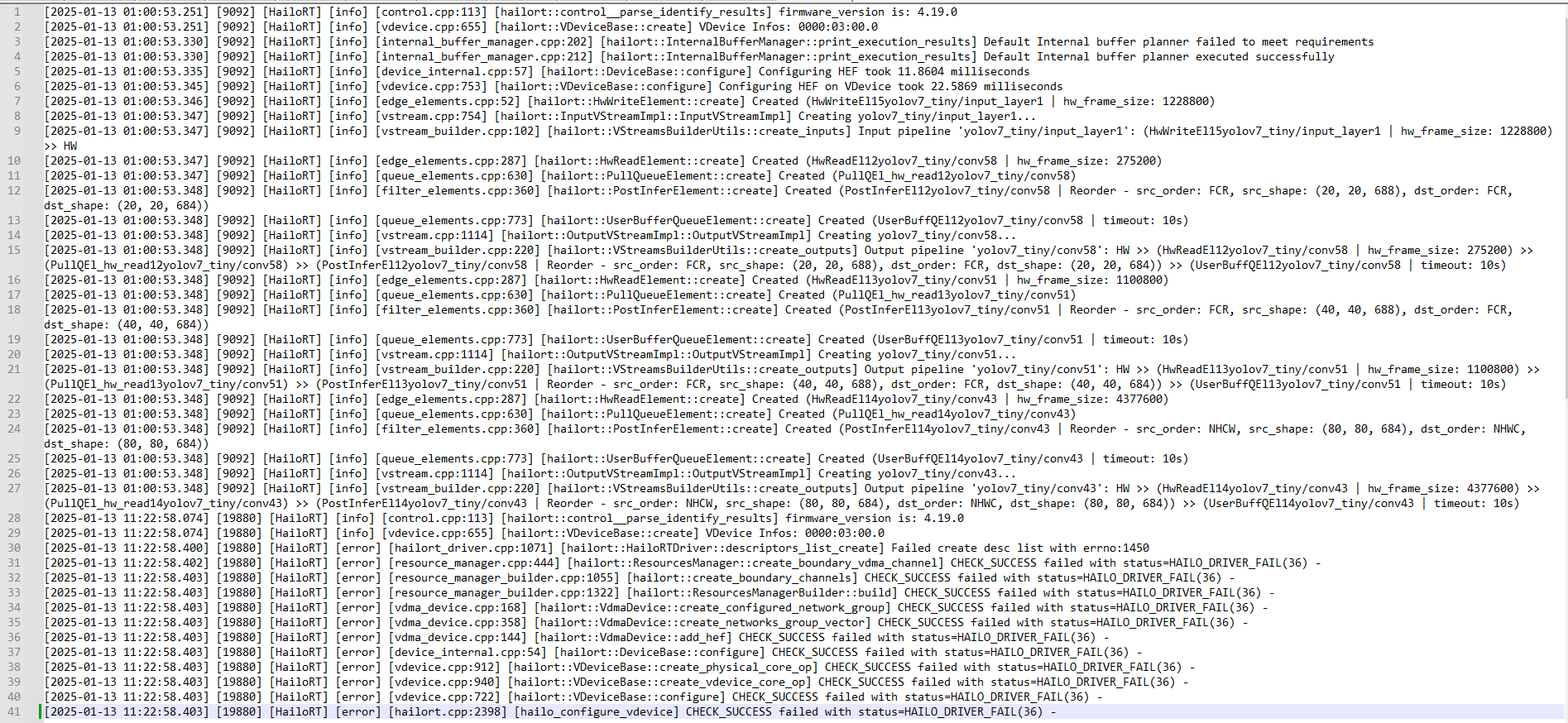However, at [2025-01-13 11:22:58.074], after closing and restarting the application, the HAILO_DRIVER_FAIL error occurred.