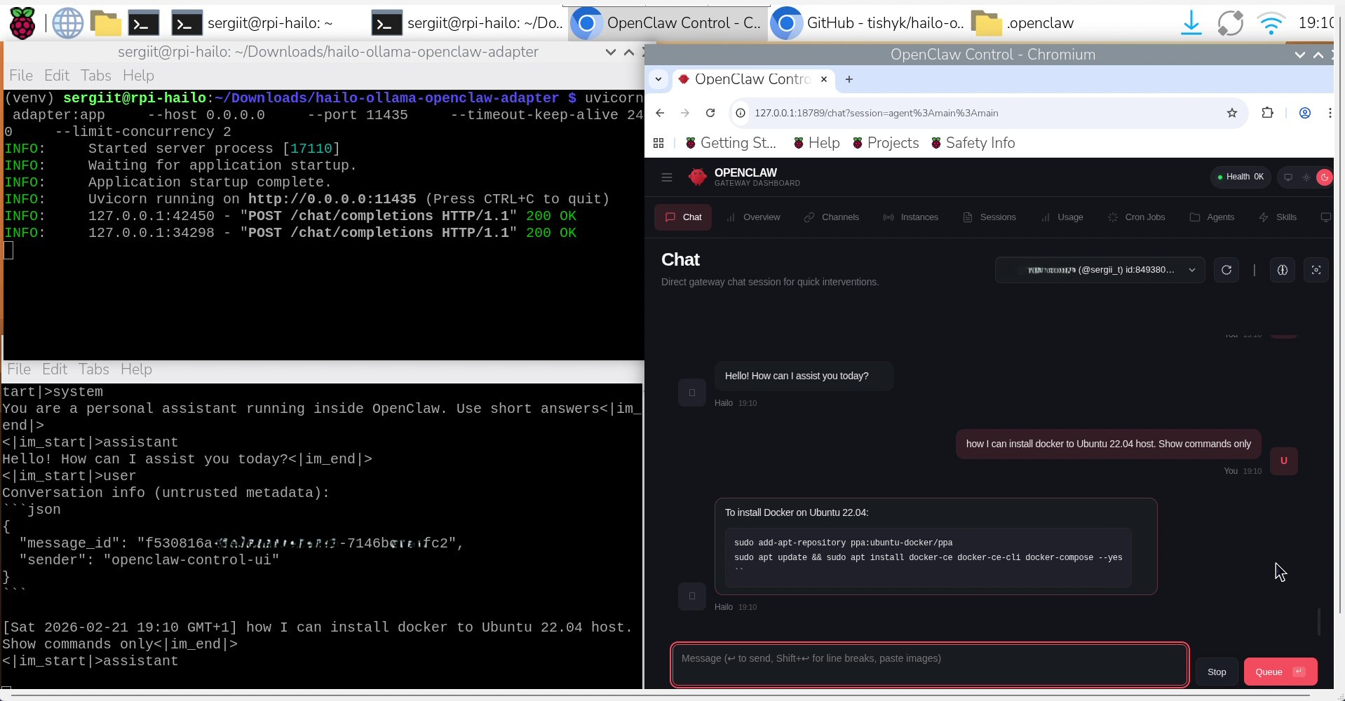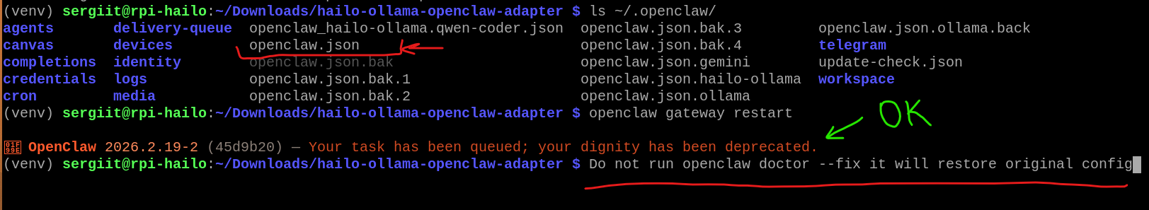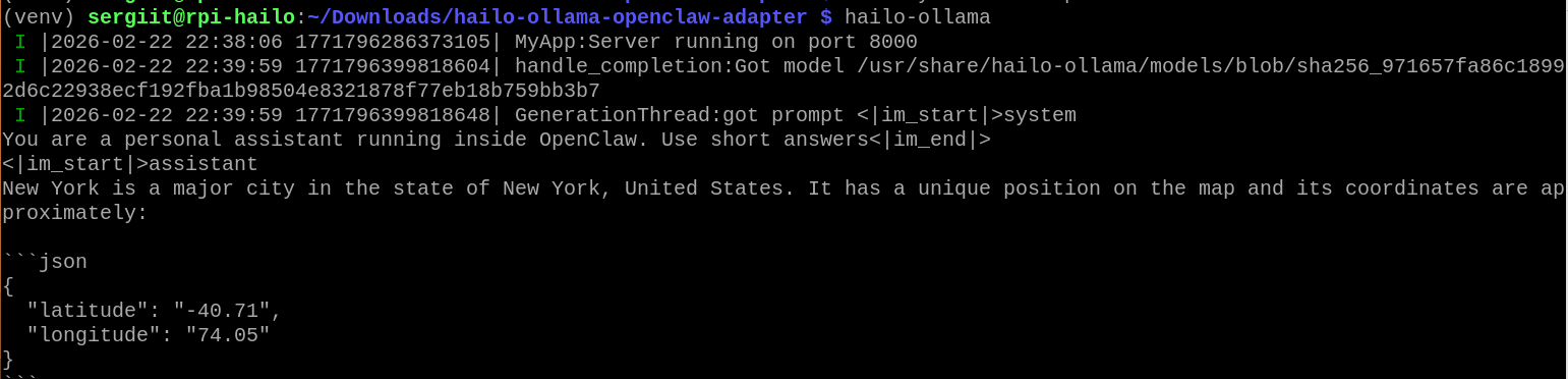 I want to share a small but useful bridge I built to get OpenClaw talking to Hailo-Ollama server (Hailo Model Zoo Gen AI) on Raspberry Pi 5 with Hailo accelerators (AI-HAT+2 in my case).