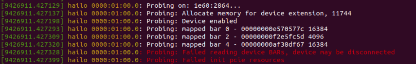 The Hailo8 driver encountered an issue during the loading process. Upon running the dmesg command, the following output was observed:
