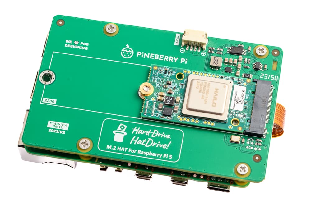 - The Pineberry Pi HatDrive! Bottom can be used with the Hailo-8 M.2 key M or B+M.