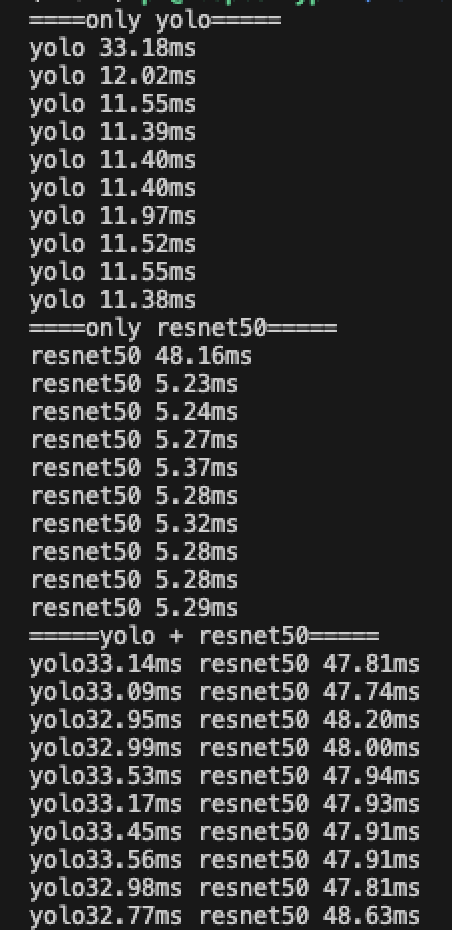 print("yolo{:.2f}ms resnet50 {:.2f}ms".format(time1*1000, time2*1000))