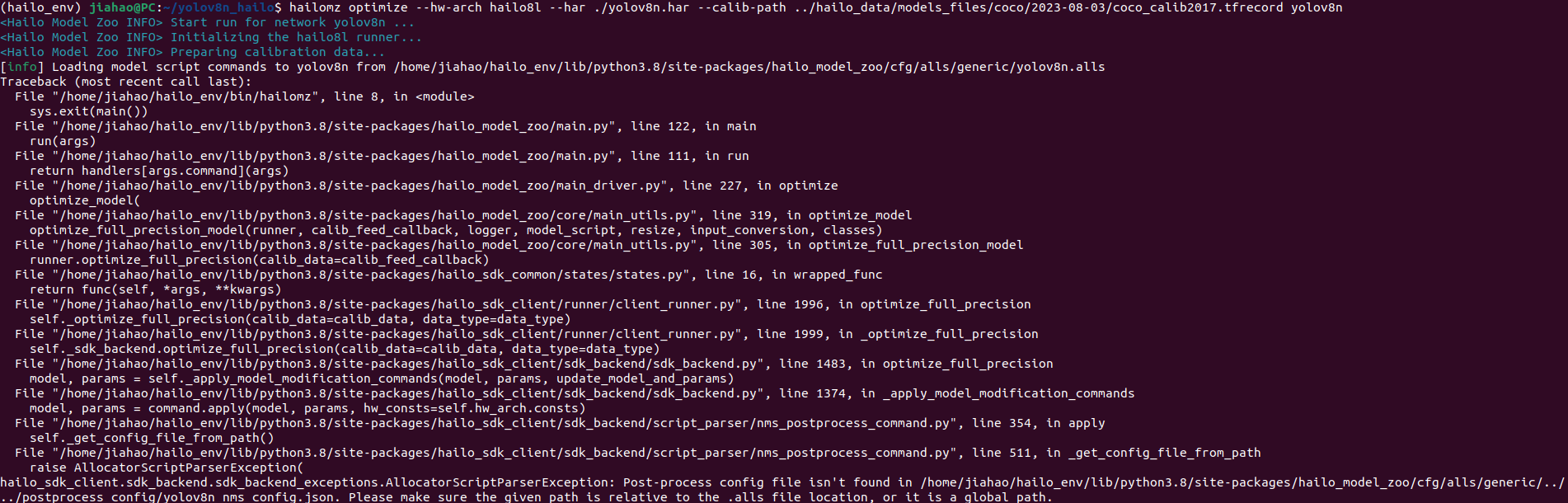 (hailo_env) jiahao@PC:~/Downloads$ hailomz optimize yolov8n --har /home/jiahao/Downloads/yolov8n.har --hw-arch hailo8l