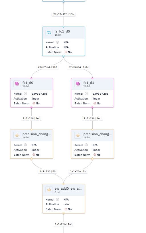 This indicates our Dataflow Compiler’s allocator couldn’t resolve the memory layout requirements between your fc1_d1 layer and the downstream element-wise add node. Our hardware optimally runs most operators in native NHCW format, and when connected operators have conflicting layout expectations, the compiler needs to insert explicit format conversions - when it can’t, you get this “mutual format” failure.