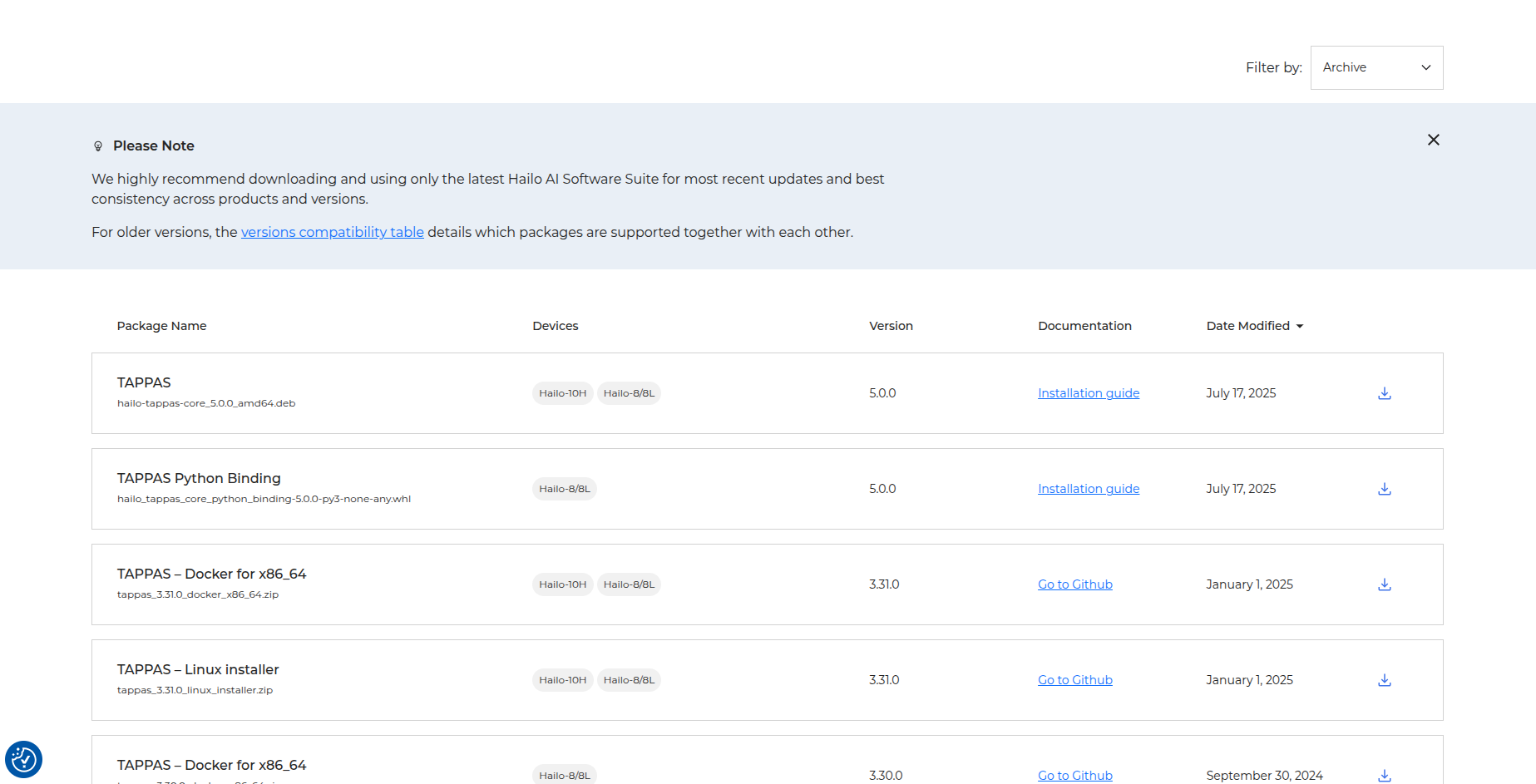 In hailo SKD version 4.22, TAPPAS V5.0.0 can be installed on Raspberry Pi and used, but on the hailo software Downloads page, there is only TAPPASV5.1, so I can’t use it. Is there another way?