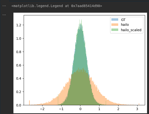 I looked at the 1D distribution of outputs and indeed it is of by some factor (GT - ground truth, hailo - net output, hailo_scaled output manyally rescaled)