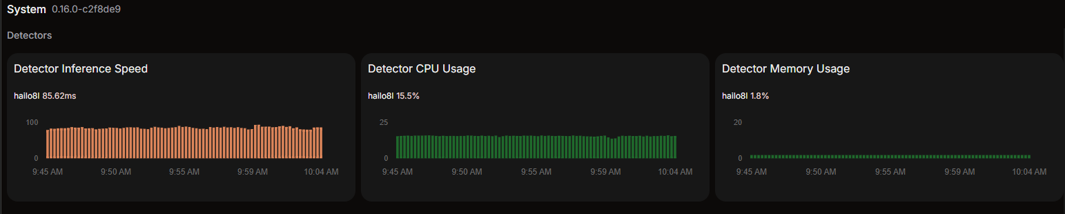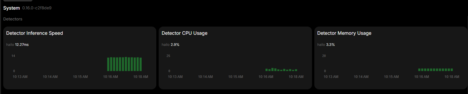 Initially I ran the default yolo model in frigate with my detect stream running at 720p, and 4k on my recording / audio stream. I was getting inference times ~17ms, CPU was never above 20%, and RAM stayed stable ~45% (expected as I’m running several other addons as well). However I found that I wasn’t getting the detections that I was hoping for on mid / far ground. So I tried several of the yolov11 models (the l, m, n, s, and x variants). Inference times went up accordingly and I found that the l variant gave me the best detections with an acceptable inference time ~75ms.