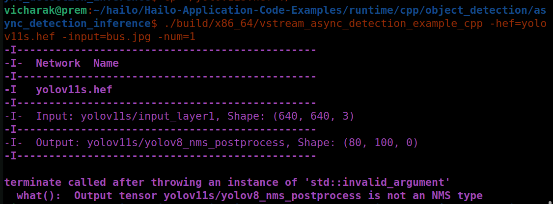 I am trying to run objection detection with yolo11s (downloaded from official hailo model-explorer website) using c++ code provided at Hailo-Application-Code-Examples repository. Exactly, I am trying to run this example. It is getting compiled correctly, but when I try to run the executable file, I receive error as: terminate called after throwing an instance of ‘std::invalid_argument’