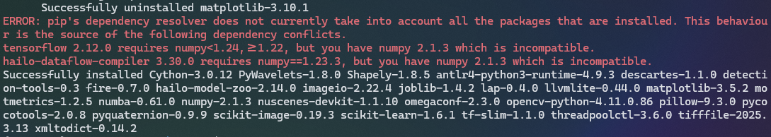 hailort 4.20.0 requires numpy<2, but you have numpy 2.1.3 which is incompatible.