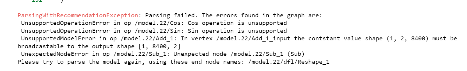 - Use Recommended End Nodes: Try parsing the model again using the suggested end node: “/model.22/df1/Reshape_1”. This may help avoid some unsupported nodes.