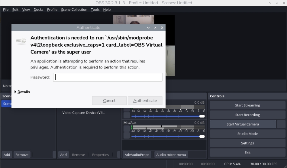 Now when I click Start Virtual Camera in OBS, I get a prompt for the password and this suggests that the exclusive_caps=1 parameter is set by OBS anyway.