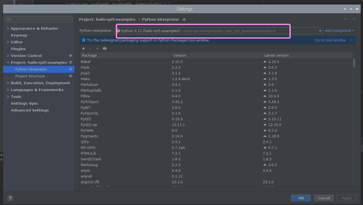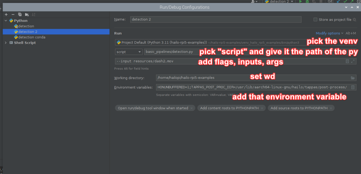 /hailo-rpi5-examples/venv_hailo_rpi5_examples/bin/python3. That will allow you pick it from the run/debug window