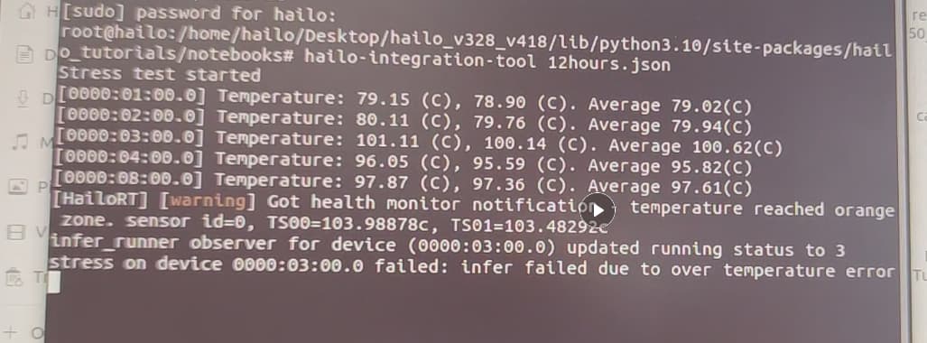 [HailoRT] [warning] Got health monitor notification - temperature reached orange zone. sensor id=0, TS00=103.98878c, TS01=103.634674c