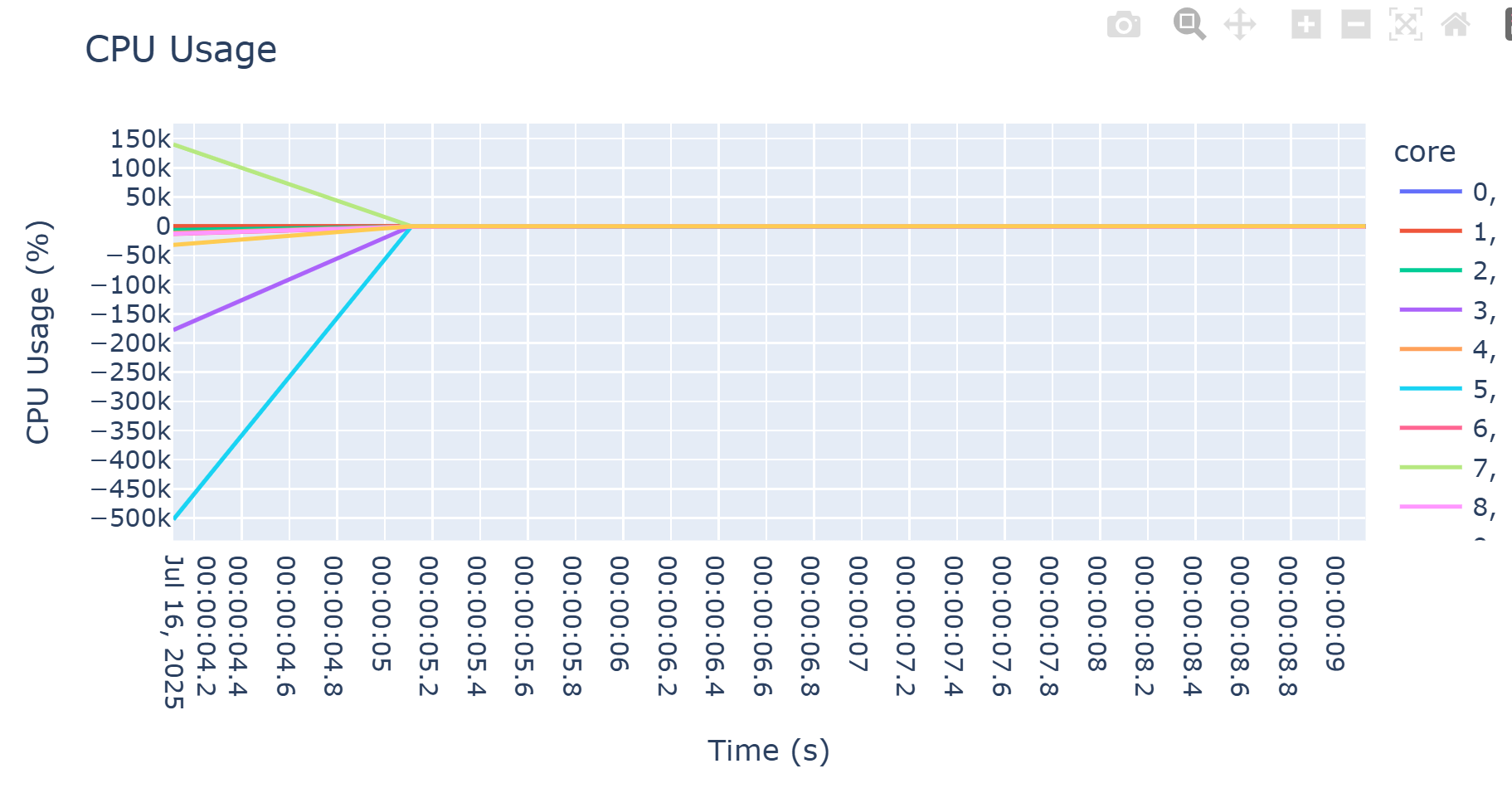 The issue is that our plotting logic treats any tracer emitting load=… fields as CPU usage data. The threadmonitor tracer reports raw CPU-time deltas in microseconds, not percentages, but these get plotted on the same “CPU Usage” axes as the actual percentage values from cpuusage. Those massive spikes and negative values you’re seeing are just thread CPU-time readings being misinterpreted as percentage data.