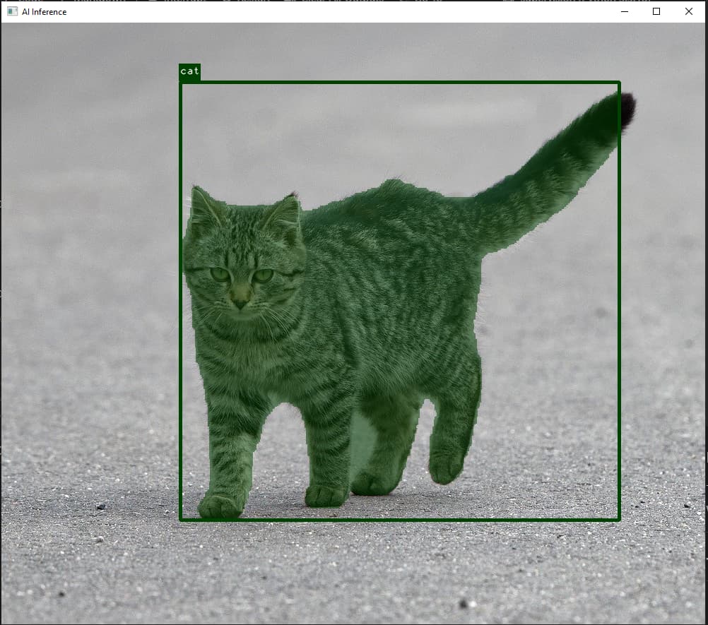 The integrated C++ postprocessing converts the model’s raw outputs into a segmentation mask overlay. To enable this processing, specify"OutputPostprocessType": "SegmentationYoloV8"in the JSON configuration. In this guide, a COCO labels file is provided for human-readable output. -